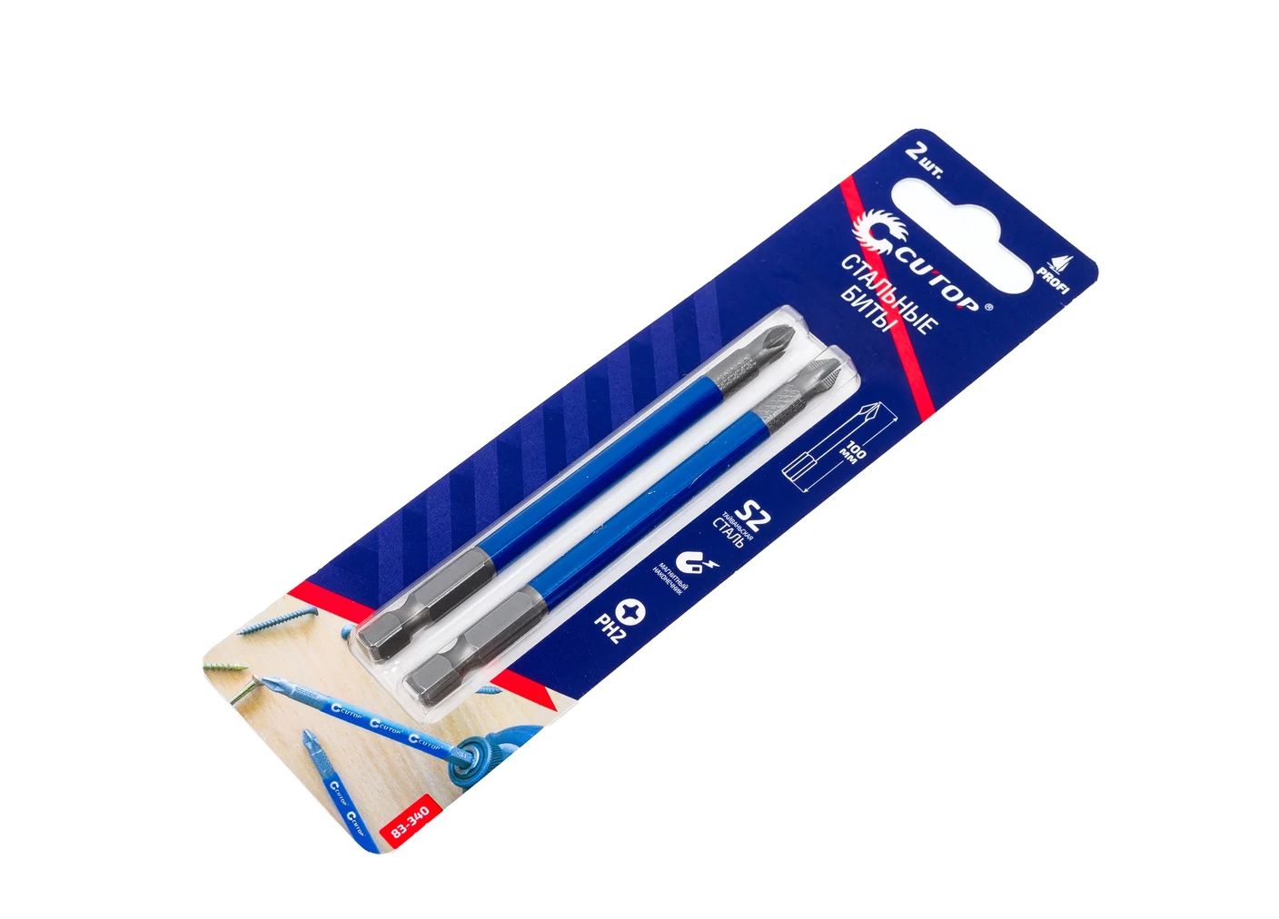 Набор стальных бит Profi (2 шт; PH2; 100 мм) CUTOP предназначен для шуруповертов и гайковертов. Биты произведены по технологии CUTOP, ресурс от 2000 шт. саморезов. Ребра биты производятся с помощью холодной штамповки, кончик проходит специальный процесс закалки при температурах до 870°C, что увеличивает срок службы и обеспечивает высокую точность.