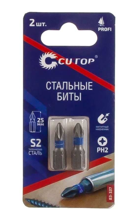 Набор стальных бит Profi (2 шт; PH2; 25 мм) CUTOP предназначен для шуруповертов и гайковертов. Биты произведены по технологии CUTOP, ресурс от 2000 шт. саморезов. Ребра биты производятся с помощью холодной штамповки, кончик проходит специальный процесс закалки при температурах до 870°C, что увеличивает срок службы и обеспечивает высокую точность.
