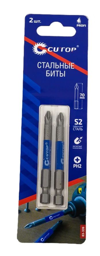 Набор стальных бит Profi (2 шт; PH2; 70 мм) CUTOP предназначен для шуруповертов и гайковертов. Биты произведены по технологии CUTOP, ресурс от 2000 шт. саморезов. Ребра биты производятся с помощью холодной штамповки, кончик проходит специальный процесс закалки при температурах до 870°C, что увеличивает срок службы и обеспечивает высокую точность.