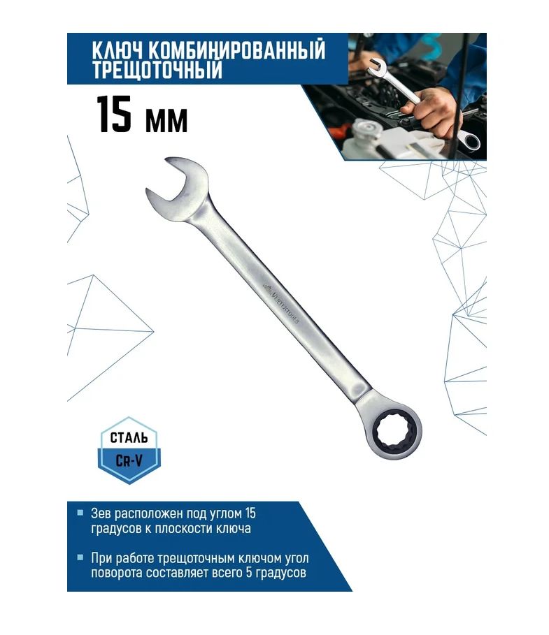 Комбинированный ключ трещоточный 15мм матовый, это удобный и компактный инструмент для работы с крепежом и резьбовыми соединениями.