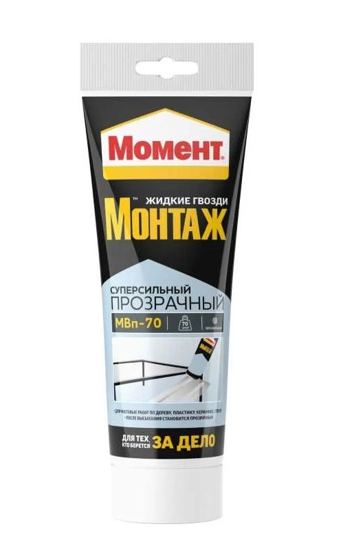 Монтажный клей МОМЕНТ Монтаж Суперсильный Прозрачный 185 г отличается высокой первоначальной силой склеивания (70 кг/м2), влаго- и морозостойкостью. Продукт используется во время различных ремонтных работ.