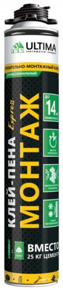 Клей-пена ULTIMA Монтаж - это однокомпонентный, готовый к применению, полиуретановый клей в аэрозольной упаковке. Предназначен для приклеивания плит и элементов отделки из пенополистирола, экструзионного пенополистирола и пенополиуретана (плиты EPS и PUR), крепления гипсокартонных и фиброцементных плит, фиксации декоративных панелей из дерева, пластмассы, МДФ и т.п.